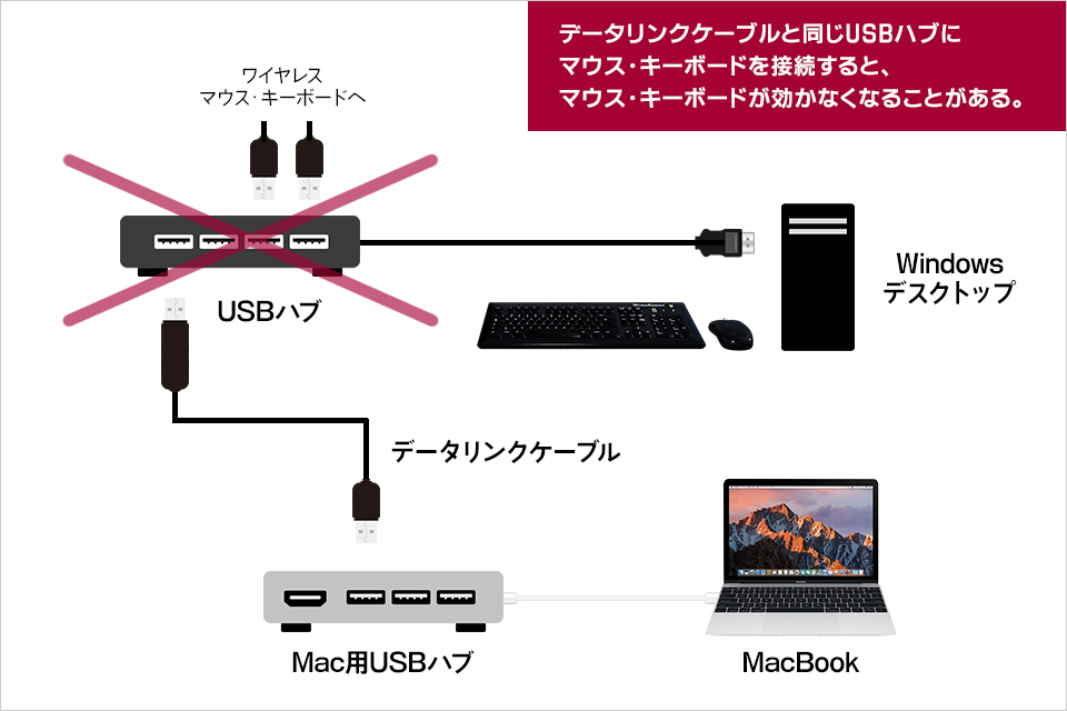 データリンクケーブルの不具合だとは思いますが、データリンク―ブルと同じUSBハブにマウス・キーボードを接続したのがいけなかったようです。